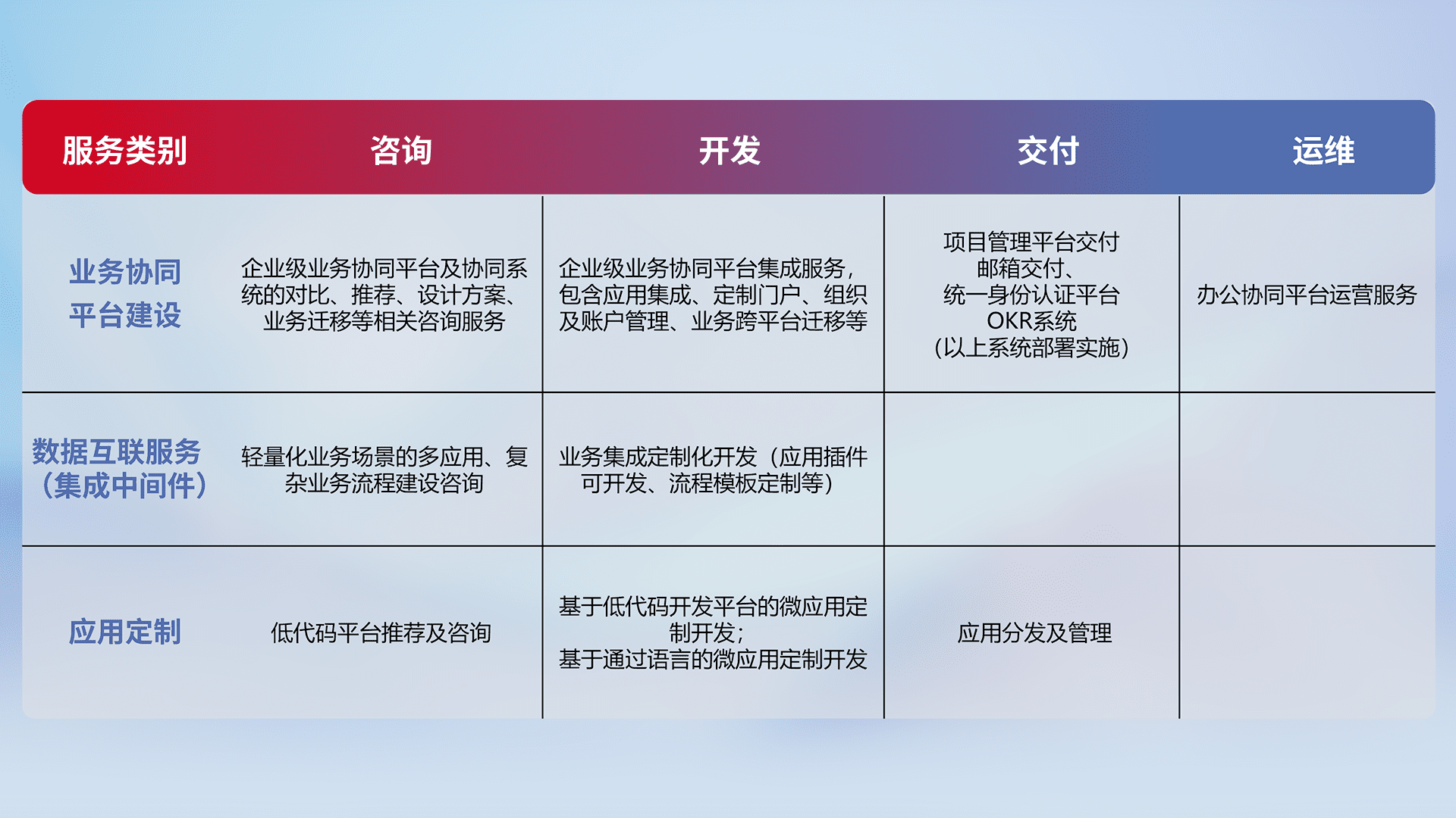 针对钉钉、、、、企微、、、IDaas等平台级产品提供产品的规划、、、、方案、、、交付、、定制化开发等服务,,,,实现如统一协同办公、、智能客户服务、、混合会议管理、、智能数据查询、、、等业务场景,,,实现数字化转型。。