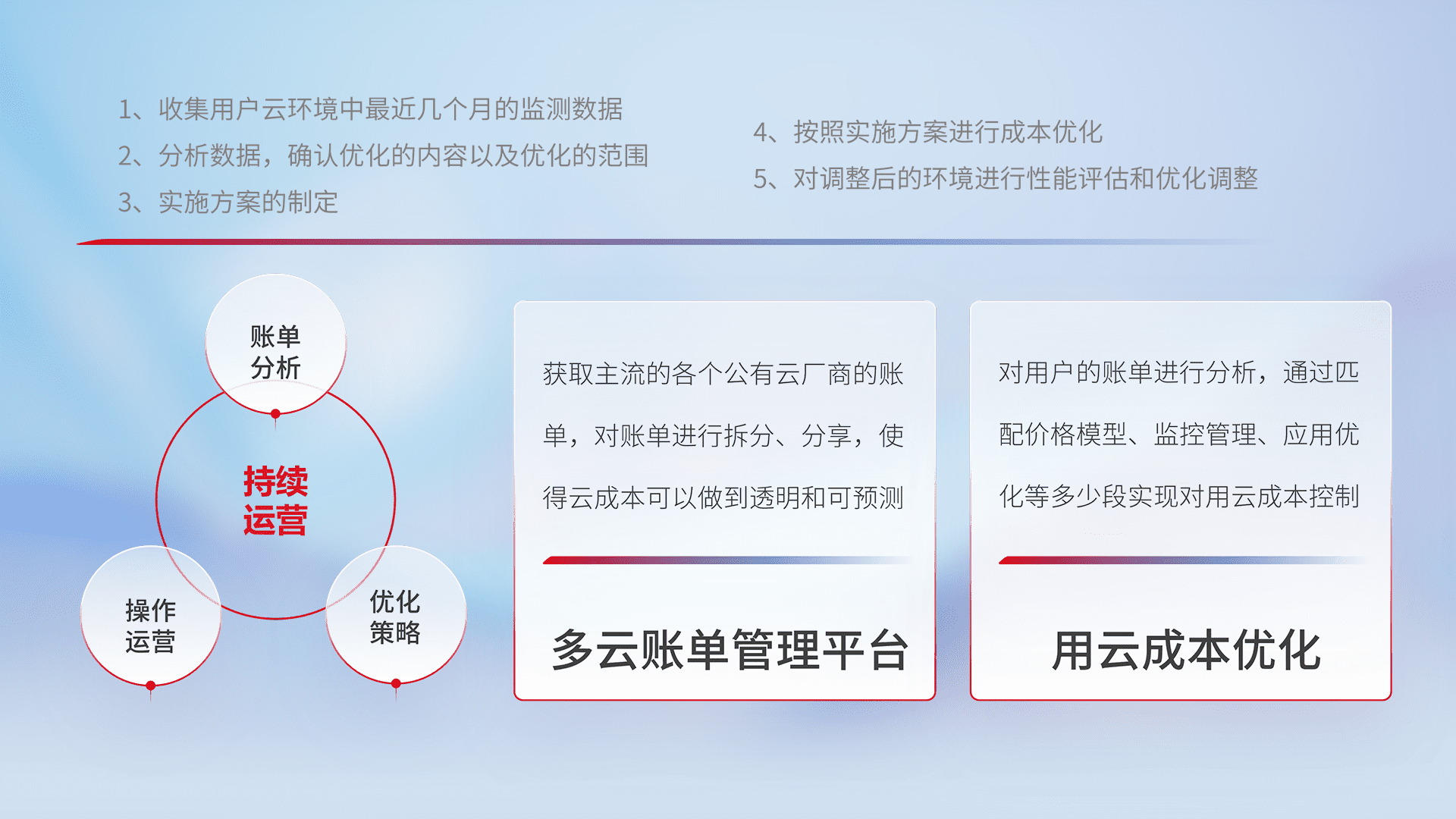 通过多云纳管,,,,以统一的资源数据模型把客户的云资源进行抽象和封装,,,进而实现对多云资源的统一操作,,,,保障云资源管理的可靠性、、稳定性与可用性。。量身定制化运维内容,,,,配置、、开发运维、、、补丁管理、、、备份、、、监控、、、、认证和访问管理、、、审计和日常巡检等,,,,保障在用云过程中的可靠度,,,稳定度以及高可用率。。。